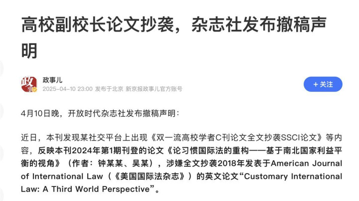4月10日晚,开放时代杂志社发布撤稿声明,起因是有网友反映该刊2024年第1期刊登的论文涉嫌全文抄袭2018年发表于AmericanJournalofInternationalLaw(《美国国际法杂志》)的英文论文。经核查,认定举报属实,论文存在严重抄袭,对文章予以撤稿。